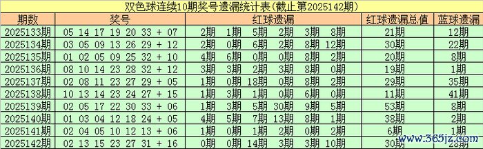 安队第2025143期双色球遗漏分析:(热码:遗漏0-3期,温码遗漏4-9期,冷码遗漏10期及以上)